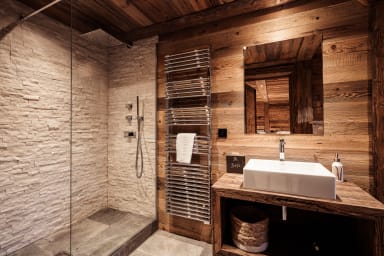 - Bathroom with shower, bathtub with view of Mont Blanc, double sink