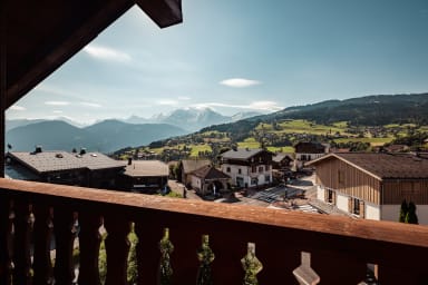 Le Cocon | Vue Mont-Blanc & centre village. Charmant appartement 4 pers. à Combloux, 51 m², 2 chambres, balcon, cuisine équipée, vue sur le Mont-Blanc et les Fiz. À 2 pas des commerces et du ski-bus pour Megève & Combloux. Linge fourni, casier à skis, déco chaleureuse. Un cocon idéal pour vos séjours en montagne !