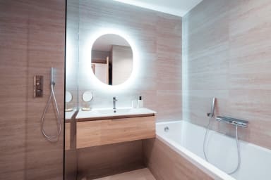 Une chambre double en suite avec salle de bains (douche + baignoire)